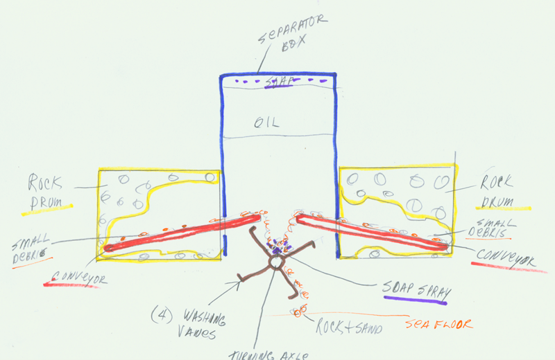 The machine described is for that specific purpose, and works in the following manner. What it does is: collect the top surface of the ocean bottom as if it were an agricultural tool on a farm. With its digging edge it lowers itself into the sea floor to scrape that top layer off. Forward momentum pushes it up the debris climb, and a rock spreader removes the "too large rocks" by pushing them to the side into a collection tray not shown/ or simply leaving them on the bottom by pushing off the side. The machine is shown with a cable attached at the most useful place, which is pulled along the sea floor by the cable, through a pulley anchored to a large movable weight/ BY the float and pull which gains its force for pulling by wave motion at sea level. A hose not shown that travels with the cable delivers oil to the float and pull from this machine, by density difference or other method. The machine works by guiding the debris or soil, up the debris climb where it encounters the stone and sand delivery drum, which is aided in its job to push sand and stone into the rock drum by a suitable surface. The pusher drum keeps various eddy currents from interfering and continues the spreading of debris in the most uniform distribution across the rock drum possible/ it may also contain a side "pin wheel" as a drive mechanism to help power the machine as it is pulled through the water (spring loaded) to account for variation in rock size/ it may need to be placed farther forward on the debris incline. The rock drum as is shown in the detail drawing, is riddled with a large number of holes sized for the kind of rock or sand being collected. What fails to fall into a hole, by escaping between the rock drum and the delivery drum is funneled in by the rubber wipe mechanism which acts to catch this. The rock drum turns, and as it turns the multiple scrubber vanes attached to this drum, pick up the rock and sand delivering it to the top of the machine by laying it on the stationary drum. Where it encounters the multiple brushes that will turn to accommodate the scrubbing action that is necessary to clean the oil off the materials. Oil and sand/ small rock will pass through the brushes contaminated with oil and fall onto the conveyor. A secondary means of cleaning the brushes inside the stationary drum is necessary (not shown). The inclined conveyor delivers the oil mixture through a side door opening to the wash box. Where this u-shaped container box contains two basic working parts: the washing vanes attached to an axle that turns. And a biodegradable soap spray incorporated into that axle which delivers the soap necessary for separating the oil and causing it to rise, within the individual area being washed. Four individual spray lines, which are energized by a simple slip ring pressure guide that releases chemicals in only one area. As the washing vanes rotate, the material moves and is dropped off by gravity onto the sea floor. It continues to rotate to repeat the process, small areas for maintaining control of the material help the rotation. More vanes work better. The washing vanes are perforated to allow flow, thereby aiding the soap. As the chemical mixture of soap and oil is lifted from the surface of the material it floats to the top of the separator/ wash box, where it is allowed to continue rising to the surface by a pre-mentioned hose, not shown.